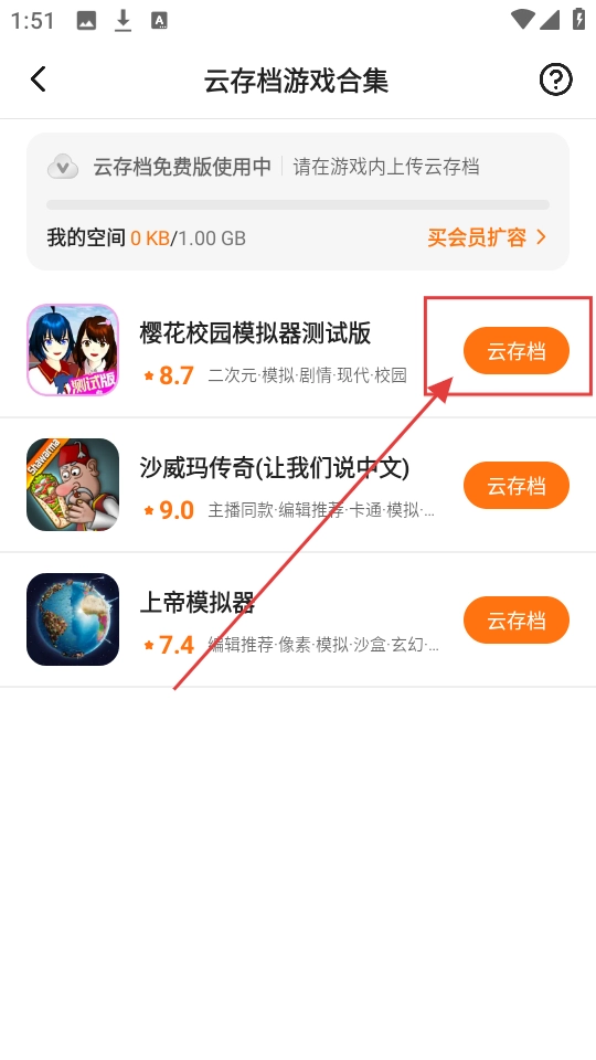 3、在云存档游戏合集页面,要是想对某款游戏执行云存档操作,点击该游戏旁边的【云存档】按钮即可。