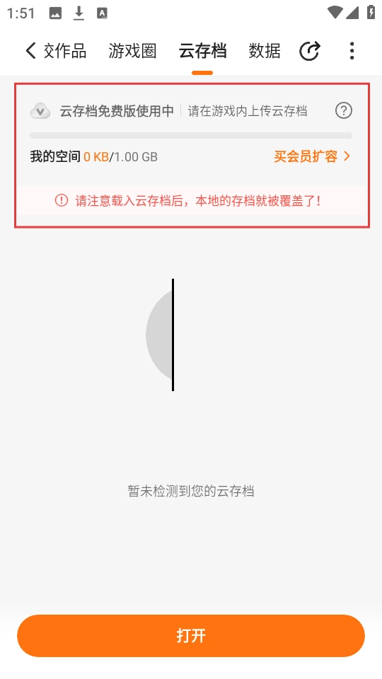 4、进入游戏云存档页面后,会看到云存档的使用提示,需要注意的是载入云存档会覆盖本地存档,请根据自身需求进行操作。