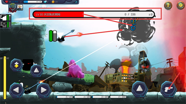 2、操控移动按钮调整角色位置,利用跳跃按钮躲避地形陷阱,靠近敌方【黑色史莱姆】。
