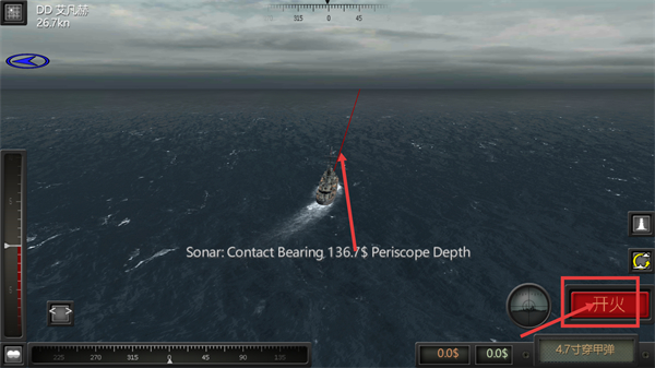 3、当目标进入射程后,结合【Sonar:Contact-Bearing-136.7$-Periscope-Depth】信息,点击【开火】使用【4.7寸穿甲弹】攻击敌方舰船。