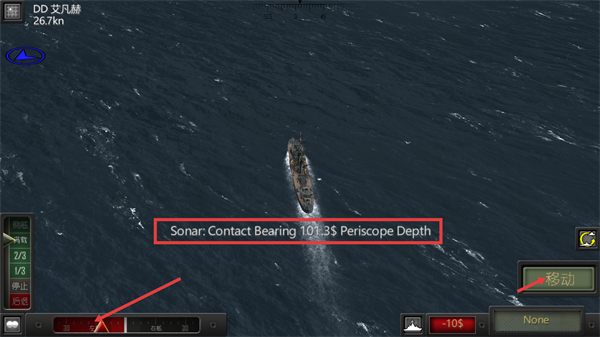 2、操控【DD艾凡赫】舰船时,关注【Sonar:Contact-Bearing-101.3$-Periscope-Depth】提示,通过【移动】调整舰船位置追踪目标。