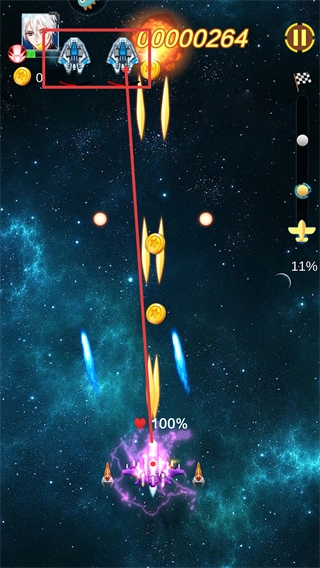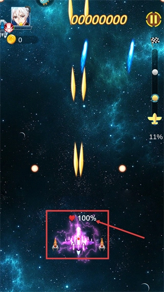 1、在太空射击场景中,维持【飞船-100%】血量,躲避敌方发射的弹幕,同时操控飞船输出火力以推进关卡。