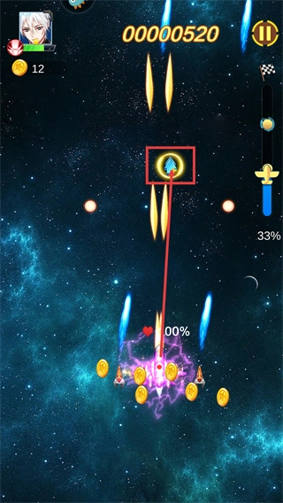 3、拾取场景中的【向上道具】强化飞船能力,关注关卡【33%】进度条,持续推进以接近关卡完成条件。
