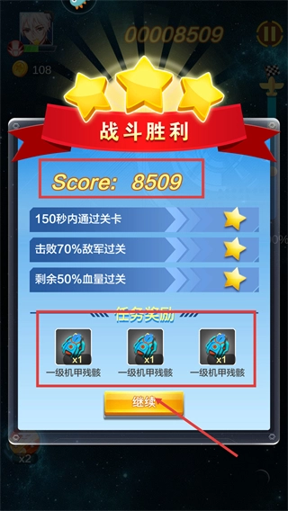 4、达成战斗胜利后,获取【Score-8509】对应的三星评价,领取【一级机甲残骸】奖励,点击【继续】进入后续环节。