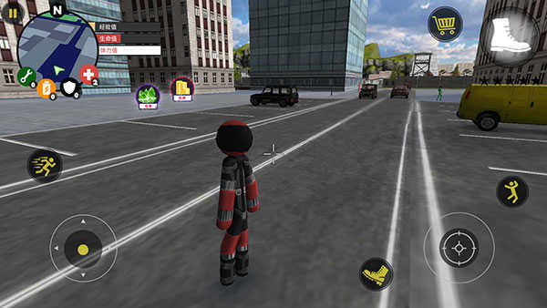 左侧控制移动与加速,右侧对应绳索和攻击(含跳跃功能),跳跃指令独立设置;屏幕右上区域实时更新武器切换状态、血量及经验数值,信息清晰直观。玩家可自由选择玩法,与其他帮派成员展开交火——击杀敌人可获取经验,连续击杀会累积星级,此时警察与周边角色将重点锁定你并发起猛烈攻击。如何在激烈对抗中存活,同时成功击杀目标人物,便是你需要完成的核心任务。
