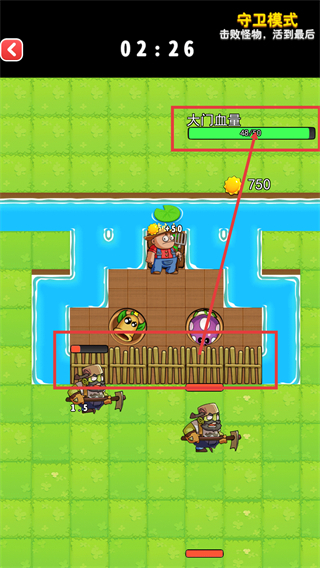 2、在【守卫模式】中,利用防御单位攻击【怪物】,同时关注【大门血量-50/50】状态,避免大门被破坏。