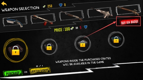 3、选择武器:在武器选择界面,选择你需要的武器,如果需要购买,点击“BUY VIA BADGE”按钮。