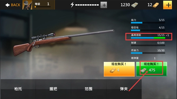 1、处于武器升级界面,等级为【1】,可消耗【475-货币】购买升级,提升武器的【最高倍数】等属性,强化狙击作战的能力。