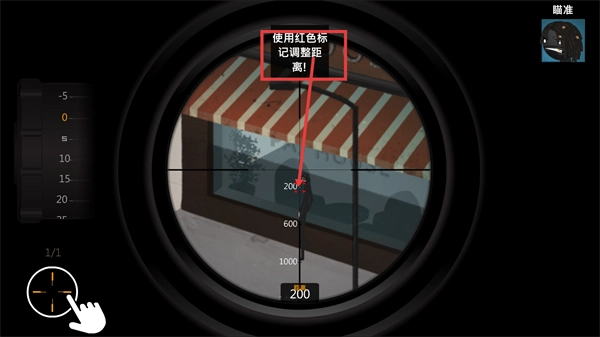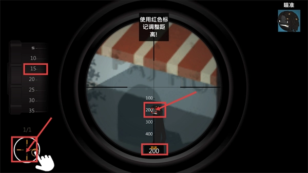 2、进入瞄准阶段,按照提示【使用红色标记调整距离】,将瞄准距离调整至【200】,精准定位目标以准备射击。