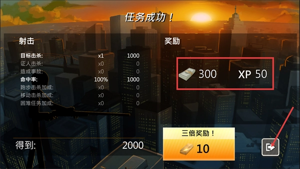 4、任务成功后,获得【300-货币】与【50-XP】,得分达【2000】,点击界面中的返回按钮可回到任务主界面。