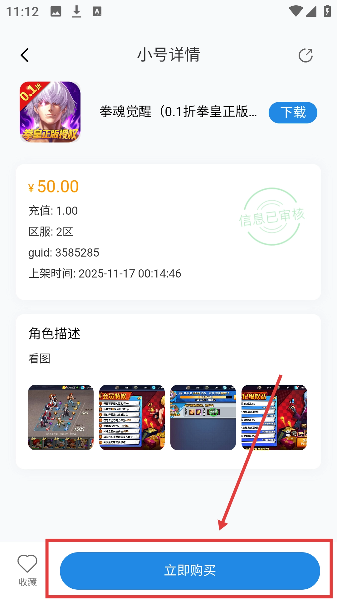 4、在小号详情界面点击【立即购买】,即可完成角色购买,开启游戏新体验啦。