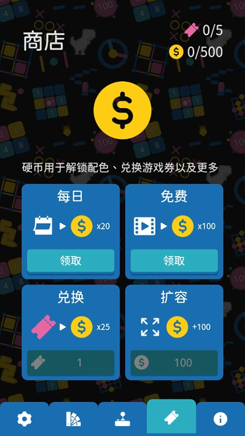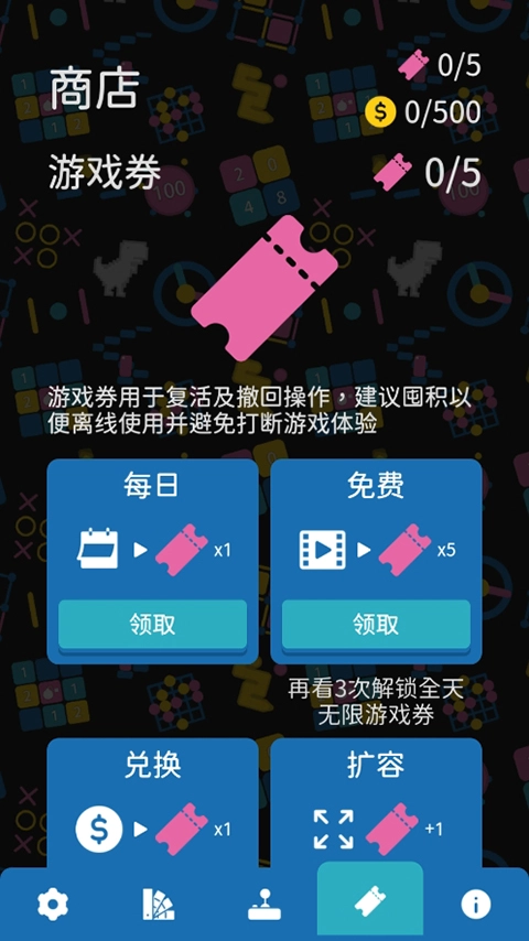 2、游戏券可用于执行复活与撤回操作。你能够通过每日刷新、金币兑换或者观看广告等方式来获取游戏券。