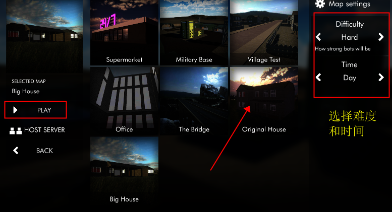 3、在界面右上角选择游戏难度与游戏时间,于中间区域挑选一张地图,随后点击左侧的“play”按钮即可开始游戏。