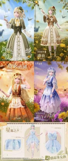 在大地图收集灵感露珠后,找蓝龙兑换,付费测时有两套,加上上次公测前瞻公布的,目前一共知道三套(应该都是四星),真的都很好看