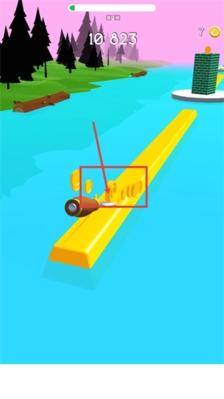 在切削木板的过程中收集沿途出现的金币,这些金币会累积到指定数值【10823】,与此同时,界面上方的金币计数(例如显示为【7】时)也会随之同步增加,所以要持续进行切削操作来获取更多的金币资源。