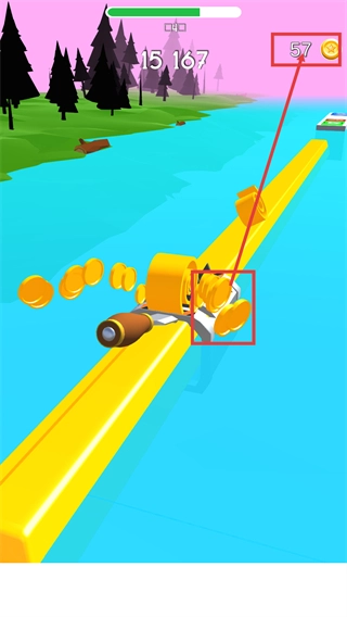 2、收集木板上的金币道具,可迅速将金币计数提升到【57】,与此同时数值会增长至【15167】,保持持续切削能更高效地积累资源,助力关卡推进。
