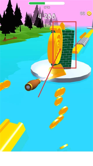 3、把切削好的木板推向【绿色砖墙】,就能达成当前阶段的目标,这时数值会暂时变成【4288】,与此同时还能继续收集掉落下来的金币。