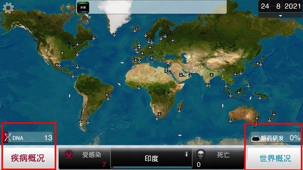 6、当积累到足够的DNA点数后,可点击左下方的病情概况,对病毒开展升级与变异操作,同时也能在右下角查看解药的研发进度。