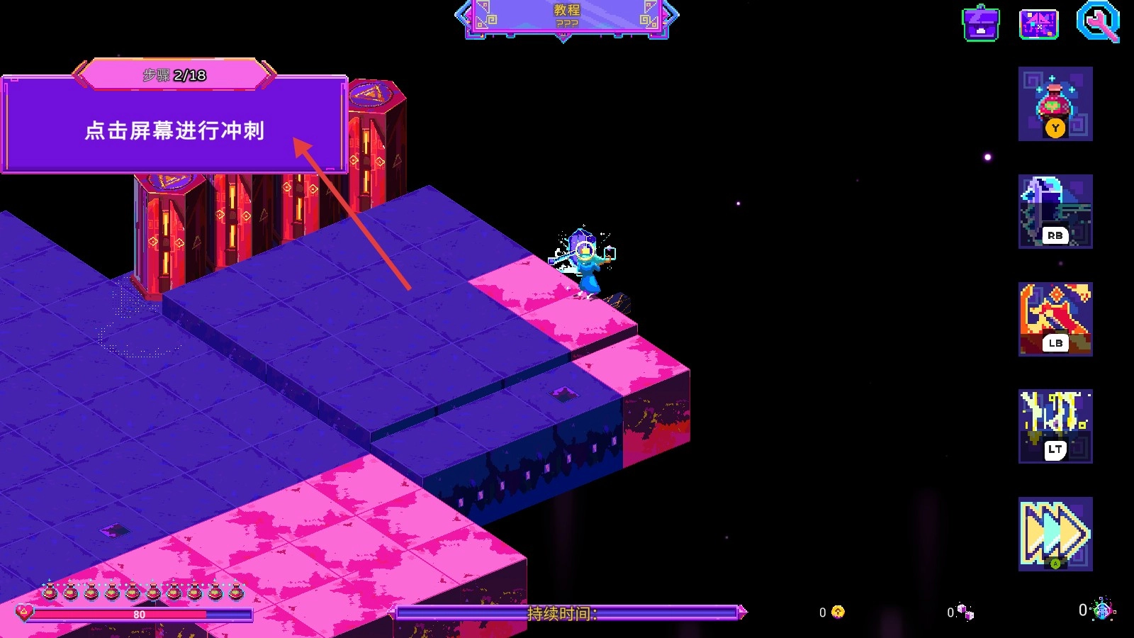 1、我们点击屏幕,操控角色冲刺,在霓虹风格的场景中灵活移动,开启冒险的第一步。