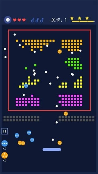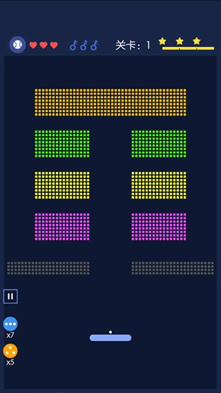 1、使用多色小球同步击碎不同颜色的砖块,利用小球的反弹特性覆盖更广区域,从而快速清除【关卡:1】中的所有砖块。