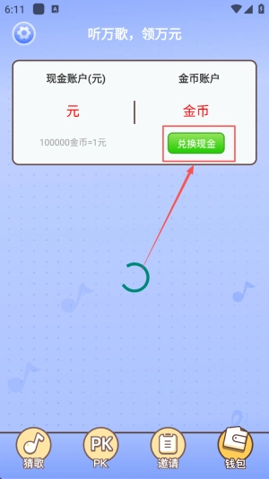 4、领取收益:当金币达到100000,点击“兑换现金”转入现金账户继续挑战。