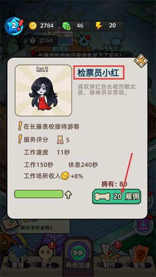 1、招募【检票员小红-Lv.1】,花费【20-骨头】,她能增加工作场所收益【+8%】,帮助长藤贵校的游客接待工作开展。