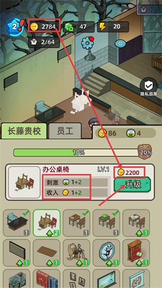 4、消耗【2200-金币】将【办公桌椅-LV.1】进行升级,能够提升【刺激-1+2】和【收入-1+2】,从而增强场所的收益能力。