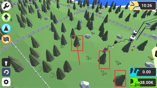 1、在主界面里,找到标注的树,目前有38.00K资源可用,先把这些树的位置锁定好,为之后的销毁操作和设施布置工作打下前期基础。