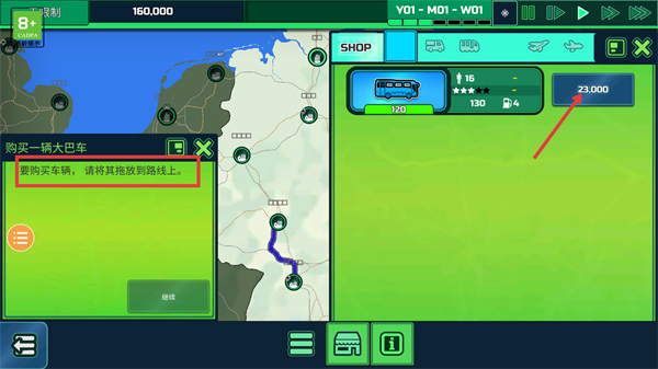 2、购买大巴车后,需将它拖拽到路线上,此操作会消耗【23000】游戏货币,操作完成即可开启客运任务。