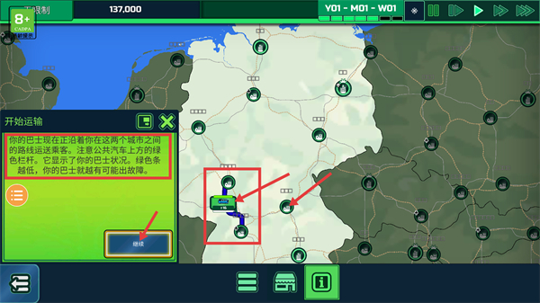 3、巴士运输过程中要留意上方的绿色栏,绿色条的高度越低,意味着故障风险越大,点击【继续】按钮就能推进运输流程。
