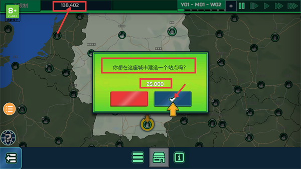 4、在城市区域可花费【25000】资源建造站点,点击确认按钮就能拓展运输网络,进而提升客运效率。