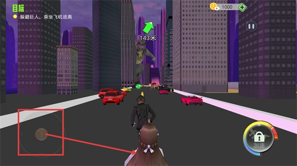 2、借助左侧操控盘来调整移动方向,注意关注【143米】的距离提示,在行进过程中避开障碍物,朝着目标方向前进。