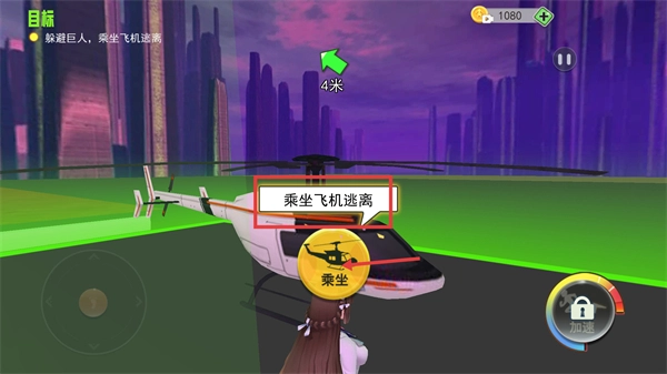 1、核心玩法围绕巨人入侵下的逃亡展开,玩家将扮演渺小的人类,需要在巨人的追捕中躲避求生,找到直升飞机并逃离城市,一旦被巨人踩踏就会挑战失败。