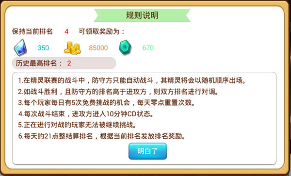 精灵联赛我会卡着时间打,一般上午先打到前80名,晚上八点再冲一波,确保排名维持在80以内,这样就能拿到140颗钻石和400积分,这个奖励还挺可观的。