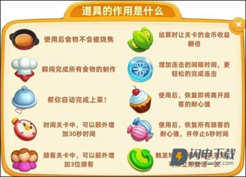 在小镇大厨这款游戏里,有各种各样的道具能让大厨们自由选择,这些道具可以助力你更轻松地通过关卡,还能让你获取更高的收益。