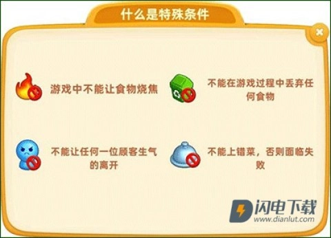 关卡里或许存在一些特殊要求,像不能把食物烤焦、不能上错菜品之类的,这些会在进入关卡时给出专门的提示。要是触发了这些要求,挑战就会宣告失败,所以一定要格外留意。