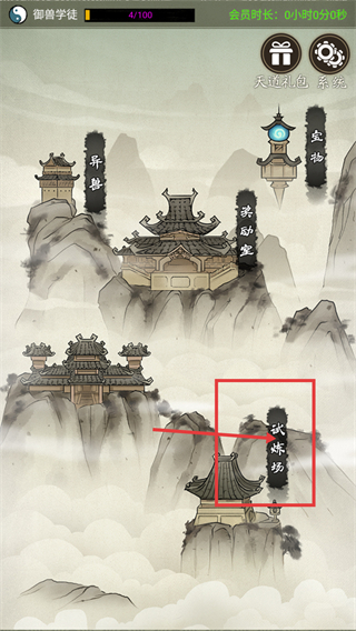 1、打开【御兽学徒-4/100】的界面,找到上面标注的【武炼场】,这个建筑是用来提升异兽战力的,大家可以结合自己当前的进度去推进异兽的养成。