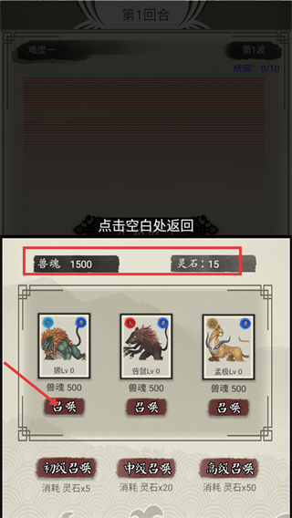 2、在召唤界面,你可以使用【兽魂-500】召唤【獬Lv0】这类异兽,还能消耗【灵石-5】进行初级召唤,以此补充己方的战力。