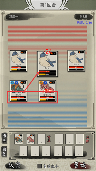 3、在【第1回合-第1波】的对战里,派遣【獬Lv0】【蜚侄Lv0】去迎战【鸟Lv1】,留意敌方的血量变化来推动战斗进程。