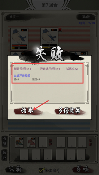 4、【第7回合】战斗失利后,点击【领取】按钮可获得【御兽师经验+4】等奖励,以此积累资源,为后续的挑战做好准备。