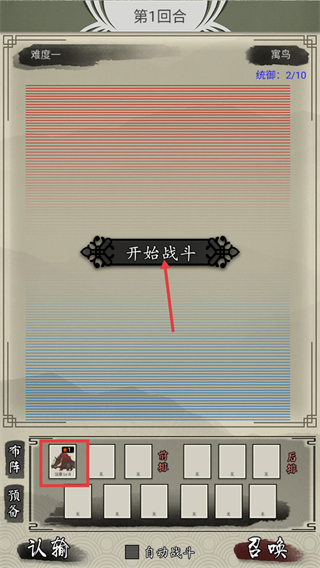 1、进入【第1回合】-难度一界面,确认【统御:2/10】以及已布阵的【当康Lv0】,点击【开始战斗】按钮启动对局。