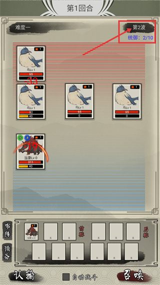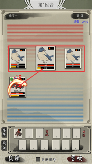 4、【第一回合】-第二波对战,敌方依旧是【鸟Lv1】,操控【当康Lv0】持续发起攻击,留意自身和敌方的血量变动情况。