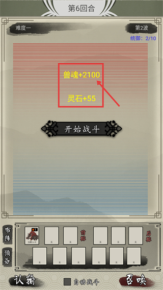 3、【第6回合】-第2波前,可领取【兽魂+2100】和【灵石+55】的奖励,确认无误后点击【开始战斗】即可进入下一波。