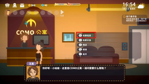 2、进入公寓后,找到前台的王英并与其交谈,在对话选项中选择“我要租房”