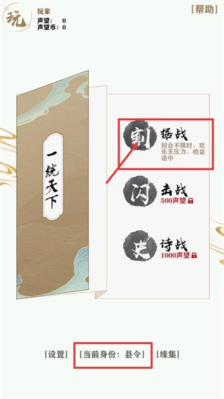 1、在【一统天下】界面里,当显示【当前身份:县令】时,可选择【割据战】模式开启对局——该模式回合不限时,欢乐无压力,收益处于适中水平,参与能积累声望与声望币。