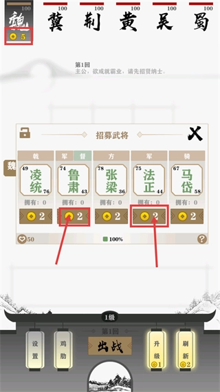 2、【第1回】需借助【招募武将】系统,花费【2金币】招募魏阵营的凌统、鲁肃等武将,完成招贤纳士来组建初始队伍。