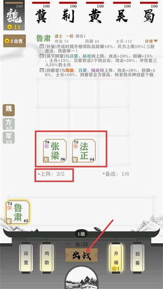 3、招募武将后,可将【张梁】与【法正】配置成【上阵:2/2】的队伍,再加上已招募的【鲁肃】,点击【出战】按钮就能开启第一回对战。