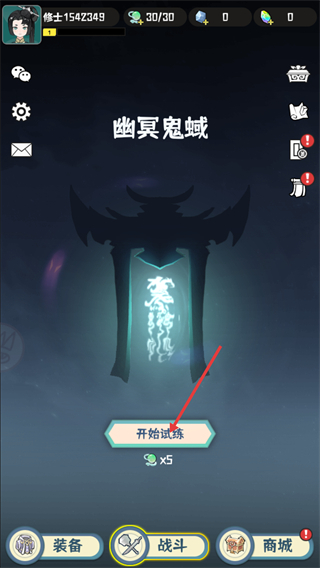 1、打开【幽冥鬼域】界面后,底部的【战斗】按钮是试炼的入口,点击【开始试炼】时需要消耗5个绿色道具。