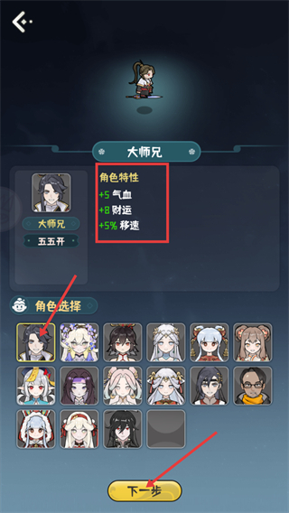 2、在【角色选择】环节,【大师兄】具备【气血+5】【财运+8】【移速+5%】的特性,选定该角色后点击底部的【下一步】按钮,即可推进后续流程。