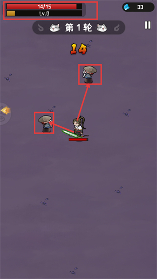 3、当前战斗处于【第1轮】阶段,需要攻击戴着斗笠的敌人。界面顶部的【14/15】是进度条显示,【Lv.0】代表当前等级,右侧还有【33】颗蓝色钻石可供留意。